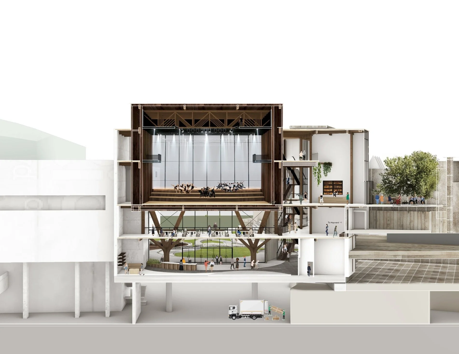 The project goal was to design a new buiding to sit on the site — a flexible theatre that could house multiple types of programs such as music, dance, play, opera and more. To do so, we were required to collaborate with thetrical experts and lighting experts and to understand every specific functions and organizations of theatrical spaces. We were encouraged to rethink the traditional language of concrete buildings and to make a set of structure that would work in harmony with its brutalist context while modifying and expanding it to become more accessible, welcoming and vibrant.