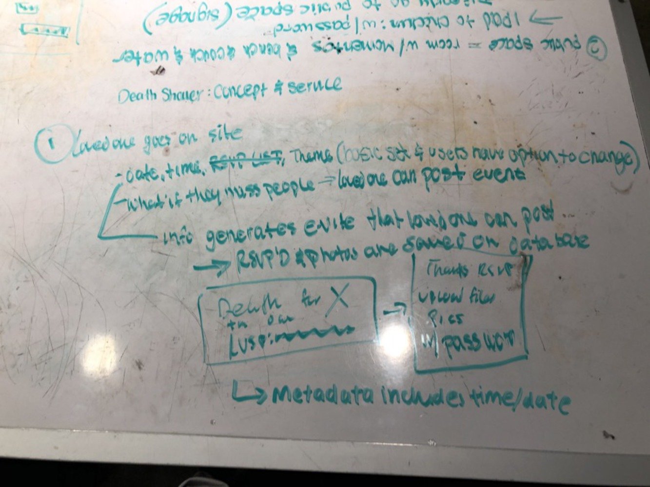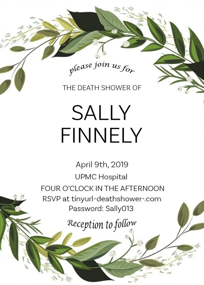 Then, guests will receive a physical invite that provides information about the specific Death Shower. This invite will have a link to RSVP, the option to upload a photo to commemorate the dying individual, which will be a part of the large timeline, and a password which will be used to confirm the guests on the day of the death shower.