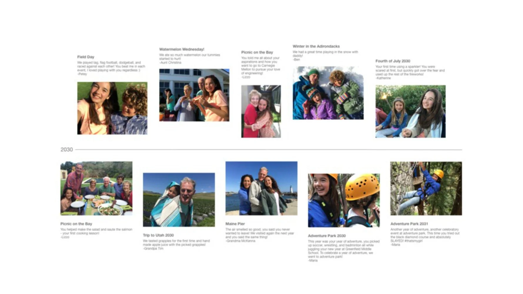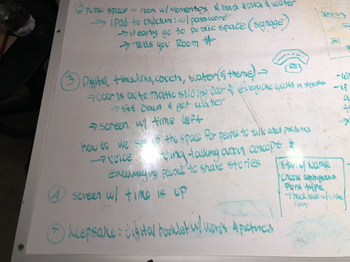As everybody walks in, a voice recording will play, reminding the users of the positive spin the death shower brings to a dying individual. Once the users settle down in their seats, the timeline compiled with everyone's memories with the dying individual will appear in a front screen. From there, guests can go up to the photos, click on them, and begin to talk about the specific memory to elicit positive emotions from the dying individual and the other guests. From there, guests will repeat this process until everybody has shared or everybody comfortable with sharing has shared.
